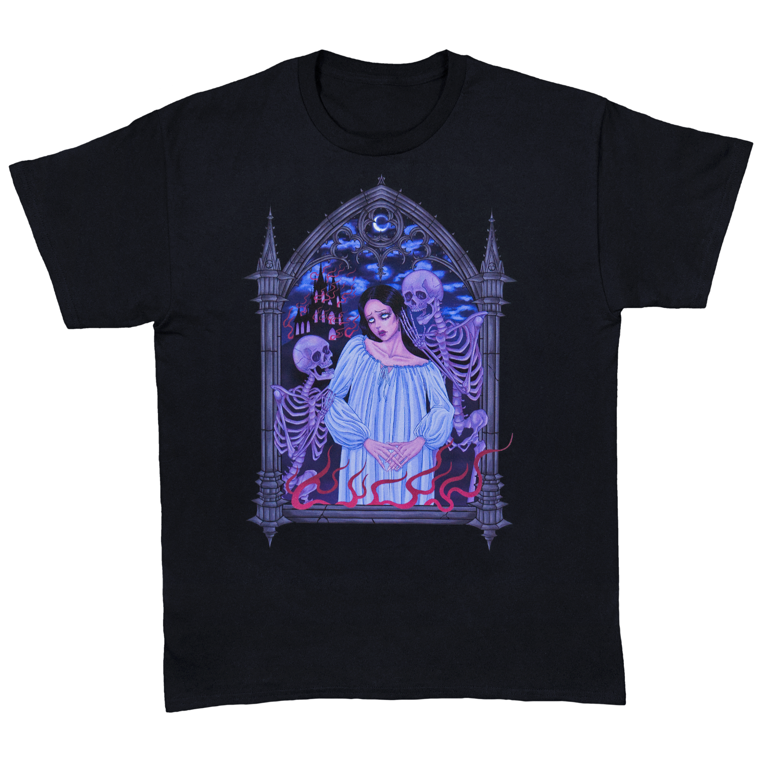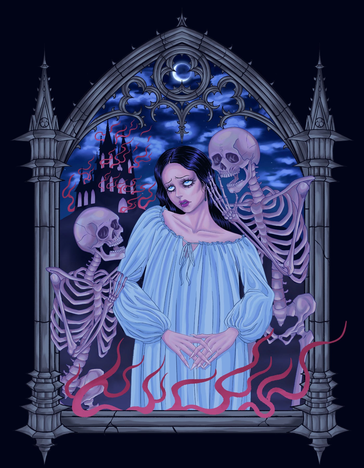 In the stillness of night, a young maiden rises, drawn by voices compelling her towards nefarious deeds. The lady of the manor stands spellbound in her nightdress beneath a waning crescent moon and cloudy night framed by gothic arches. A distant cathedral burns behind her as she heeds the irresistible whispers of undead skeletons surrounding her.